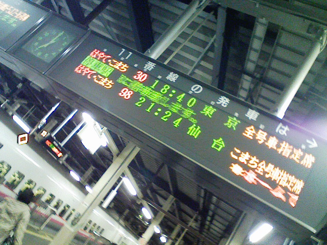 投稿日時: 2008年02月21日 23:56 | パーマリンク 2008年02月24日新幹線が??今週もマメに安比へ暴風雪警報の中、ゲレンデでは新幹線が止まったよ!と放送が流れる。まあ夕方までにはなんとかなるだろうとお気楽に滑っていると12時頃運転再開のお知らせがあるも、ふたたび14時頃には倒木で運転見合わせとのこと。すぐに再開したらしいが盛岡駅にいってみるとまだ遅れている模様。しかし、はやてこまち30号は定刻です。という情報。しばらくすると10分遅れです。と放送が入る。その後、20分遅れです。そのまたその後30分遅れです・・・。まあとりあえず帰れることがわかったので清次郎のお寿司と銀河高原ビールをもって待機。無事帰りました。 投稿日時: 2008年02月24日 23:39 | パーマリンク |